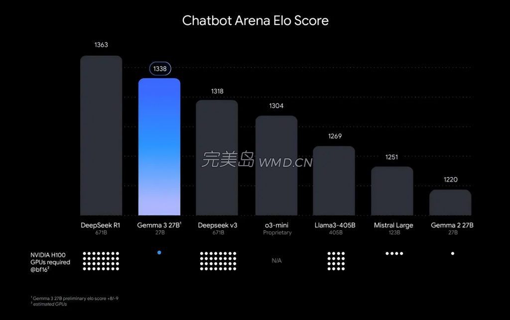 该模型的性能优势在 Chatbot Arena Elo Score 排行榜上得到了清晰的体现。尽管只需要一块 NVIDIA H100 GPU,Gemma 3 的旗舰 27B 版本仍跻身顶级聊天机器人之列,Elo 得分达到 1338。许多竞争对手需要多达 32 个 GPU 才能提供相当的性能。