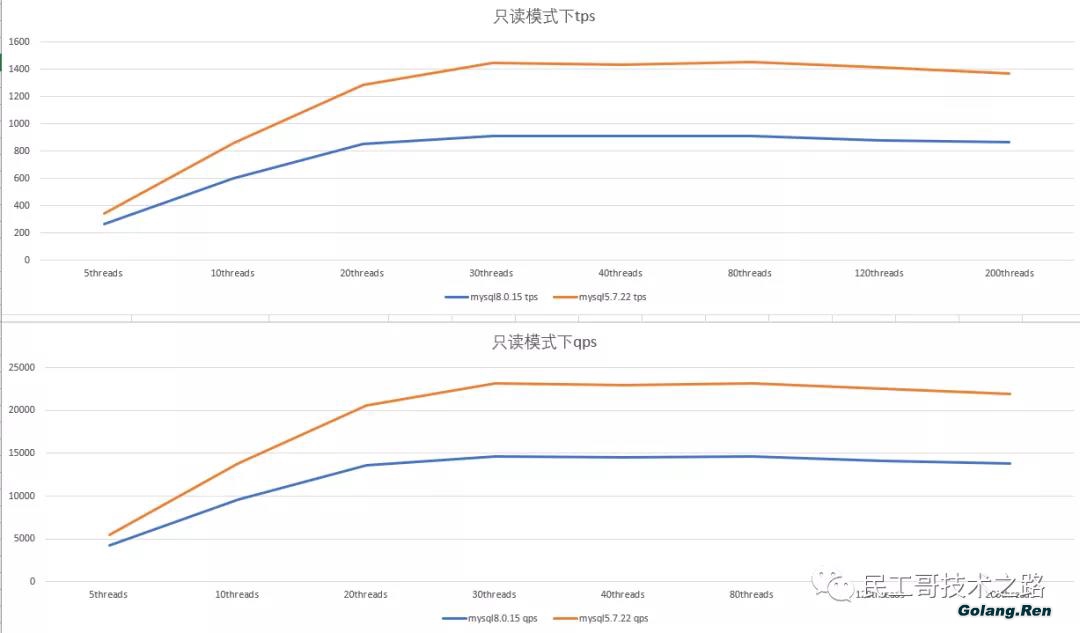 0 2配置,只读模式下,mysql5.7.22性能比mysql8.0.15 好1/3左右;随着并发数的上升,性能也没有上升,反而有下降的趋势.