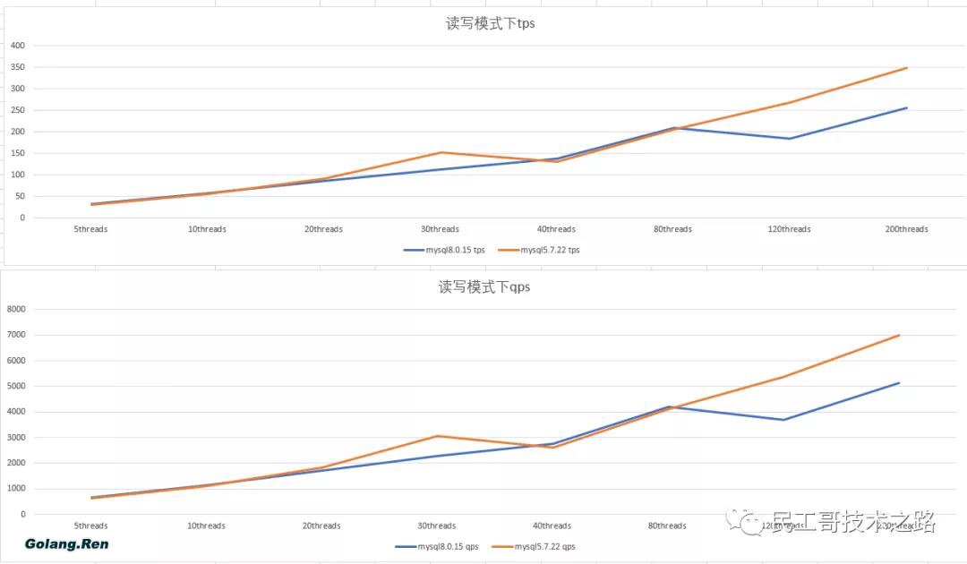 - 整体来看,mysql5.7.22在读写模式、只读模式、只写模式下的表现是优于mysql8.0.15的
